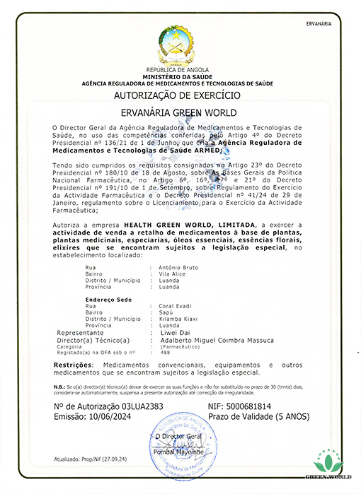 近日,绿世界国际在国际市场拓展领域传来重磅喜讯。历经多年战略布局与积极申报,安哥拉分公司、赤道几内亚分公司及南苏丹分公司相继拿到所在国政府药监局核发的医药经营销售许可,获准销售保健品与常规药品。这一成果不仅标志着绿世界国际成功开辟了全新市场方向,更有力地提升了在全球大健康领域的综合竞争力。安哥拉共和国卫生部药品和技术监管局执业许可赤道几内亚共和国卫生与社会福利...