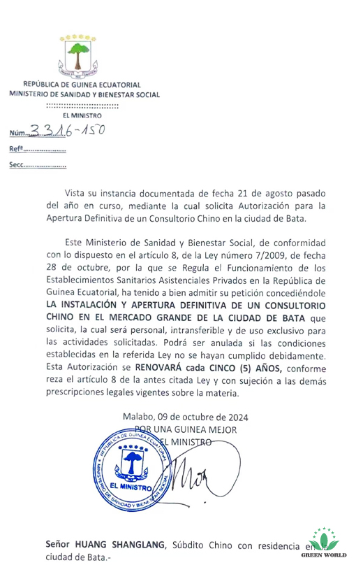 赤道几内亚共和国卫生与社会福利部执业许可