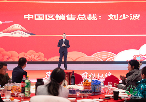 随后,沃德绿世界董事、中国区总裁刘少波先生登台致辞。他的发言充满力量,系统回顾了过去一年公司在市场开拓、业绩增长方面取得的亮眼成就,并对表现卓越的销售团队与合作伙伴给予了高度表扬。同时,他发布了新一年的战略目标与行动纲领,以激昂的话语激励全体同仁,在2026年要以“骏马奔腾”之势,勇闯新程,再创辉煌!